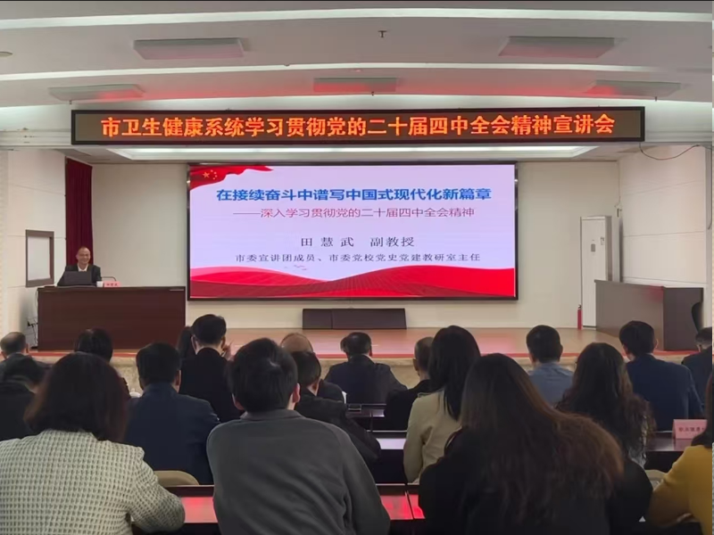 为全面深入学习领会党的二十届四中全会精神,引导市直卫生健康系统广大党员干部准确把握全会精神实质和丰富内涵,12月5日,市卫生健康局召开学习贯彻党的二十届四中全会精神宣讲会,邀请市委宣讲团成员、市委党校党史党建教研室主任、副教授田慧武同志作主题宣讲。局机关全体党员干部、局直属各单位分管负责同志参加会议。