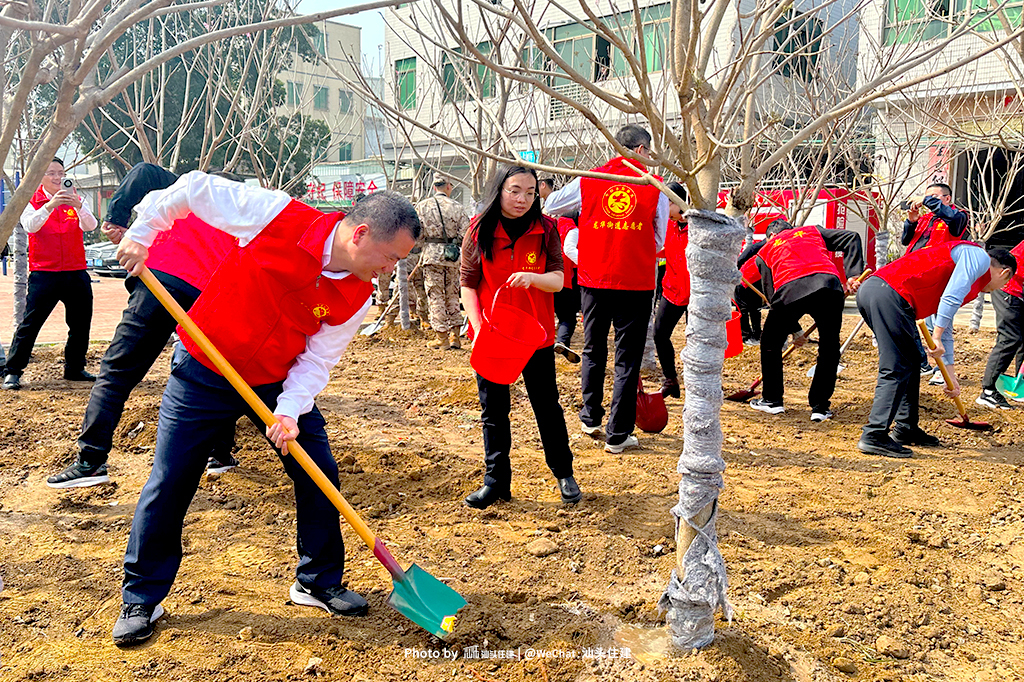 在南社村大池文化公园,党员干部、武警官兵、志愿者们分工协作,有人挥锹挖坑、扶正树苗,有人培实填土、浇水灌溉,一丝不苟地完成每个环节。大家干劲十足,合力栽下130棵黄花风铃木,为乡村增添一片新绿。